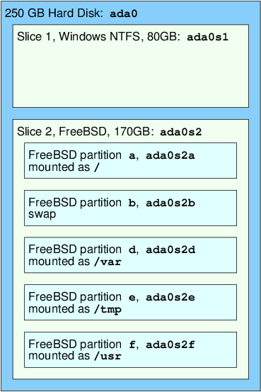 Disks in FreeBSD are divided into slices, referred to in Windows® as partitions, which are numbered from 1 to 4. These are then divided into partitions, which contain file systems, and are labeled using letters.