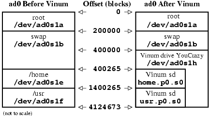 Our goal in this phase is get Vinum set up and running on the root spindle. We will embed the existing /usr and /home filesystems in a Vinum partition. Note that the Vinum volumes created will not yet be failure-resilient since we have only one underlying Vinum drive to hold them. The resulting system will automatically start Vinum as it boots to multi-user mode.
