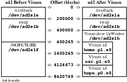 Greg Lehey suggested this bootstrapping method. It uses knowledge of how Vinum internally allocates disk space to avoid copying data. Instead, Vinum objects are configured so that they occupy the same disk space where /stand/sysinstall built filesystems. The filesystems are thus embedded within Vinum objects without copying.