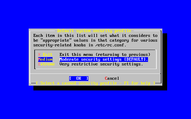 Please note that the security profile is just a default setting. All programs can be enabled and disabled after you have installed FreeBSD by editing or adding the appropriate line(s) to /etc/rc.conf. For more information, please see the rc.conf(5) manual page.
