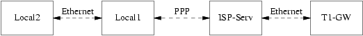 Remember, since the PPP interface is using an address on the ISP's local network for your side of the connection, routes for any other machines on the ISP's local network will be automatically generated. Hence, you will already know how to reach the T1-GW machine, so there is no need for the intermediate step of sending traffic to the ISP server.