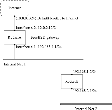 In this scenario, RouterA is our FreeBSD machine that is acting as a router to the rest of the Internet. It has a default route set to 10.0.0.1 which allows it to connect with the outside world. We will assume that RouterB is already configured properly and knows how to get wherever it needs to go. (This is simple in this picture. Just add a default route on RouterB using 192.168.1.1 as the gateway.)
