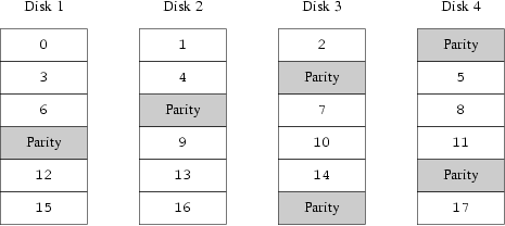 An alternative solution is parity, implemented in the RAID levels 2, 3, 4 and 5. Of these, RAID-5 is the most interesting. As implemented in Vinum, it is a variant on a striped organization which dedicates one block of each stripe to parity of the other blocks. As implemented by Vinum, a RAID-5 plex is similar to a striped plex, except that it implements RAID-5 by including a parity block in each stripe. As required by RAID-5, the location of this parity block changes from one stripe to the next. The numbers in the data blocks indicate the relative block numbers.