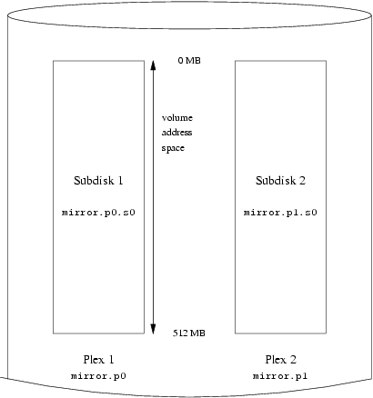 In this example, each plex contains the full 512 MB of address space. As in the previous example, each plex contains only a single subdisk.
