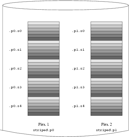 The subdisks of the second plex are offset by two drives from those of the first plex: this helps ensure that writes do not go to the same subdisks even if a transfer goes over two drives.