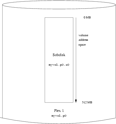 This figure, and the ones which follow, represent a volume, which contains the plexes, which in turn contain the subdisks. In this trivial example, the volume contains one plex, and the plex contains one subdisk.