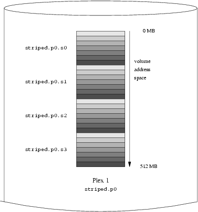 This volume is represented in Figure 19-6. The darkness of the stripes indicates the position within the plex address space: the lightest stripes come first, the darkest last.