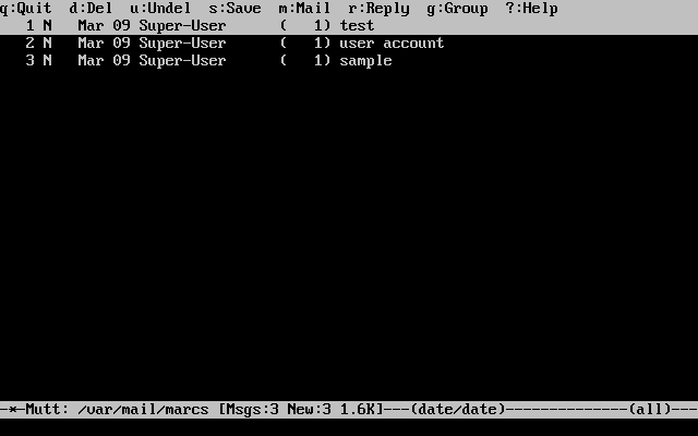 Mail version 8.1 6/6/93. Type ? for help. "/var/mail/marcs": 3 messages 3 new >N 1 root@localhost Mon Mar 8 14:05 14/510 "test" N 2 root@localhost Mon Mar 8 14:05 14/509 "user account" N 3 root@localhost Mon Mar 8 14:05 14/509 "sample"
