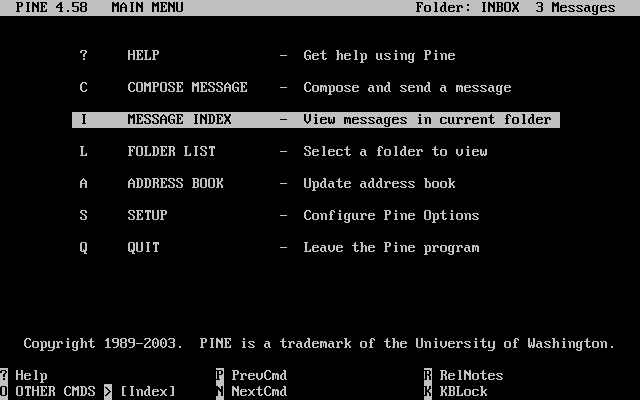Users are then presented with the main menu, which can be easily navigated using the cursor keys. This main menu provides shortcuts for the composing new mails, browsing of mail directories, and even the administration of address book entries. Below the main menu, relevant keyboard shortcuts to perform functions specific to the task at hand are shown.