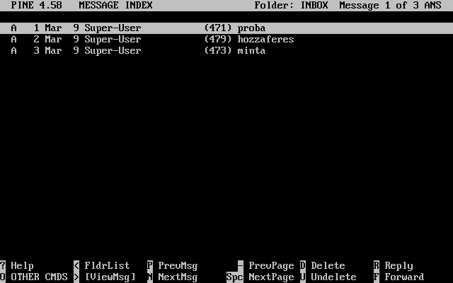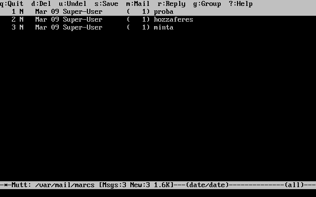 Mail version 8.1 6/6/93. Type ? for help. "/var/mail/marcs": 3 messages 3 new >N 1 root@localhost Mon Mar 8 14:05 14/510 "proba" N 2 root@localhost Mon Mar 8 14:05 14/509 "felhasznaloi hozzaferes" N 3 root@localhost Mon Mar 8 14:05 14/509 "minta"