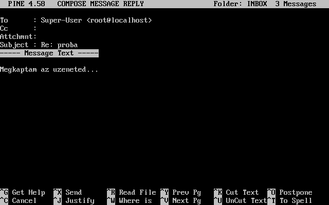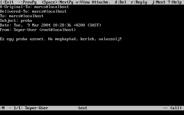 & mail root@localhost Subject: Elsajatitottam a mail hasznalatat Most mar en is tudok levelet irni es fogadni a mail hasznalataval... :) . EOT