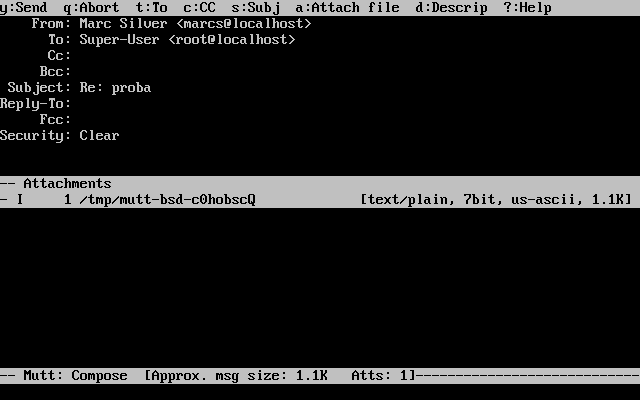 Egy új levél megírásához nyomjuk le az m gombot. Miután elláttuk érvényes témával a levelet, a mutt elindítja a vi(1) szövegszerkesztőt és nekiláthatunk a levél szövegének. Amint befejeztük, mentsük el és lépjünk ki a vi szerkesztőből. Ezután visszakapjuk a mutt felületét, ahol a küldendő e-mail összefoglalását láthatjuk. A levelet végül az y lenyomásával küldhetjük el. Erre a következő képen láthatunk egy példát: