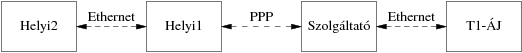A Helyi1 és Helyi2 gépek a hálózatunk tagjai. A Helyi1 az internet-szolgáltatót éri el egy betárcsázós PPP kapcsolaton keresztül. A PPP szerver a külső felületén keresztül a helyi hálózaton pedig egy másik átjáróhoz csatlakozik.