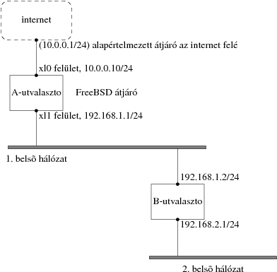 Ebben a forgatókönyvben az A-utvalaszto a mi FreeBSD-s gépünk, amely az internet felé vezető útválasztó szerepét játssza. Számára az alapértelmezett útvonal a 10.0.0.1, amelyen keresztül a külső világot tudja elérni. Feltételezzük, hogy a B-utvalaszto nevű gépet már eleve jól állítottuk be, ezért tudja merre kell mennie. (A kép alapján egyszerű: csak vegyünk fel egy alapértelmezett útvonalat a B-utvalaszto géphez, ahol így a 192.168.1.1 lesz az átjáró.)