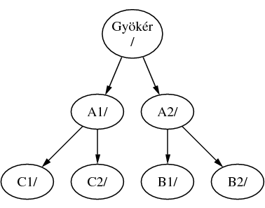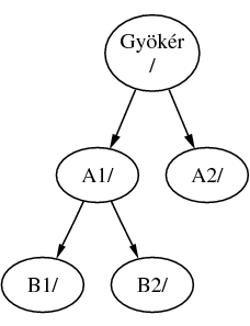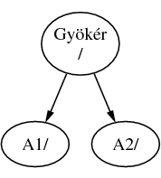 Nevezzük A-t a gyökér állományrendszernek. Ha a könyvtár tartalmának megjelenítéséhez most kiadnánk az ls parancsot, két alkönyvtárat látnánk, az A1-et és A2-t. A létrejött könyvtárfa valahogy így nézne ki: