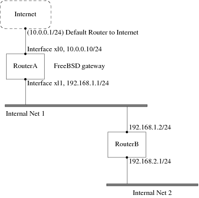 RouterA, ein FreeBSD-Rechner, dient als Router für den Zugriff auf das Internet. Die Standardroute ist auf 10.0.0.1 gesetzt, damit ein Zugriff auf das Internet möglich wird. Wir nehmen nun an, dass RouterB bereits konfiguriert ist und daher weiß, wie er andere Rechner erreichen kann. Dazu wird die Standardroute von RouterB auf 192.168.1.1 gesetzt, da dieser Rechner als Gateway fungiert.
