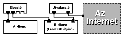 Ezt úgy tudjuk elérni, ha az internethez kapcsolódó FreeBSD-s gépet átjárónak állítjuk be. Ebben az átjáróban legalább két hálózati felületnek kell léteznie -- az egyikkel az internetes útválasztóhoz, a másikkal pedig a helyi hálózathoz kapcsolódik. A belső hálózaton levő gépek egy hub vagy egy switch segítségével csatlakoznak egymáshoz.