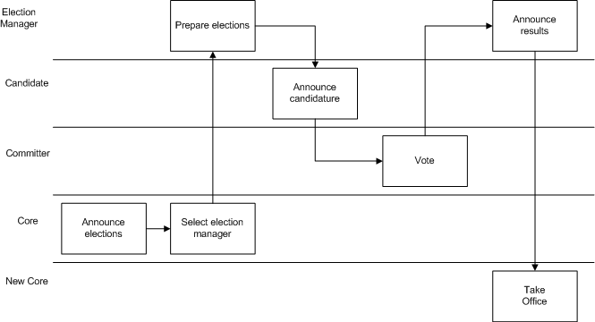Core announces the election and selects an election manager. He prepares the elections, and when ready, candidates can announce their candidacies through submitting their statements. The committers then vote. After the vote is over, the election results are announced and the new core team takes office.