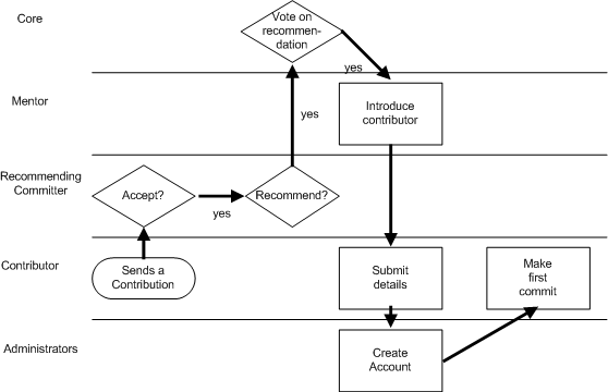 When a contributor sends a piece of code, the receiving committer may choose to recommend that the contributor is given commit privileges. If he recommends this to core, they will vote on this recommendation. If they vote in favour, a mentor is assigned the new committer and the new committer has to email his details to the administrators for an account to be created. After this, the new committer is all set to make his first commit. By tradition, this is by adding his name to the committers list.