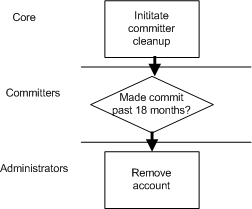 Recall that a committer is considered to be someone who has committed code during the past 12 months. However, it is not until after 18 months of inactivity have passed that commit privileges are eligible to be revoked. [FreeBSD, 2002H] There are, however, no automatic procedures for doing this. For reactions concerning commit privileges not triggered by time, see section 1.5.8.
