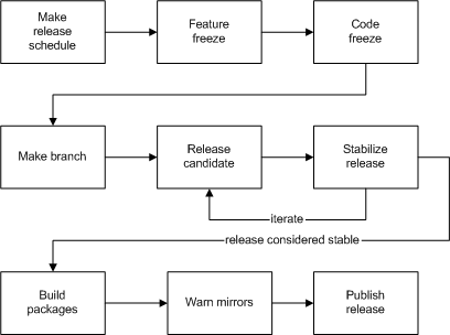 These are the stages in the release engineering process. Multiple release candidates may be created until the release is deemed stable enough to be released.