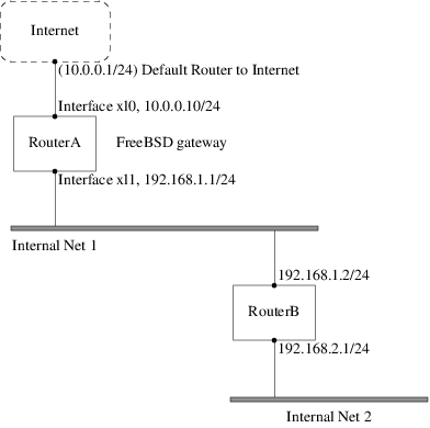 In this scenario, RouterA is our FreeBSD machine that is acting as a router to the rest of the Internet. It has a default route set to 10.0.0.1 which allows it to connect with the outside world. We will assume that RouterB is already configured properly and knows how to get wherever it needs to go. (This is simple in this picture. Just add a default route on RouterB using 192.168.1.1 as the gateway.)